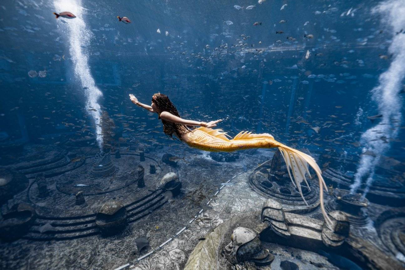 想象一下,屏住呼吸的瞬间,你透过巨大的玻璃幕墙,凝视着一片深邃的蓝色。 阳光穿透水面,折射出粼粼波光,如同无数颗碎钻在摇曳。 就在这片静谧而神秘的水域中,一位身着鱼尾的舞者正翩然起舞,每一个流畅的转身,每一次优雅的摆动,都像是在诉说着一个古老而又充满魅力的传说。这不是童话故事,而是正在三亚·亚特兰蒂斯上演的2024中国美人鱼公开赛年度总冠军赛暨亚洲杯赛的真实场景。