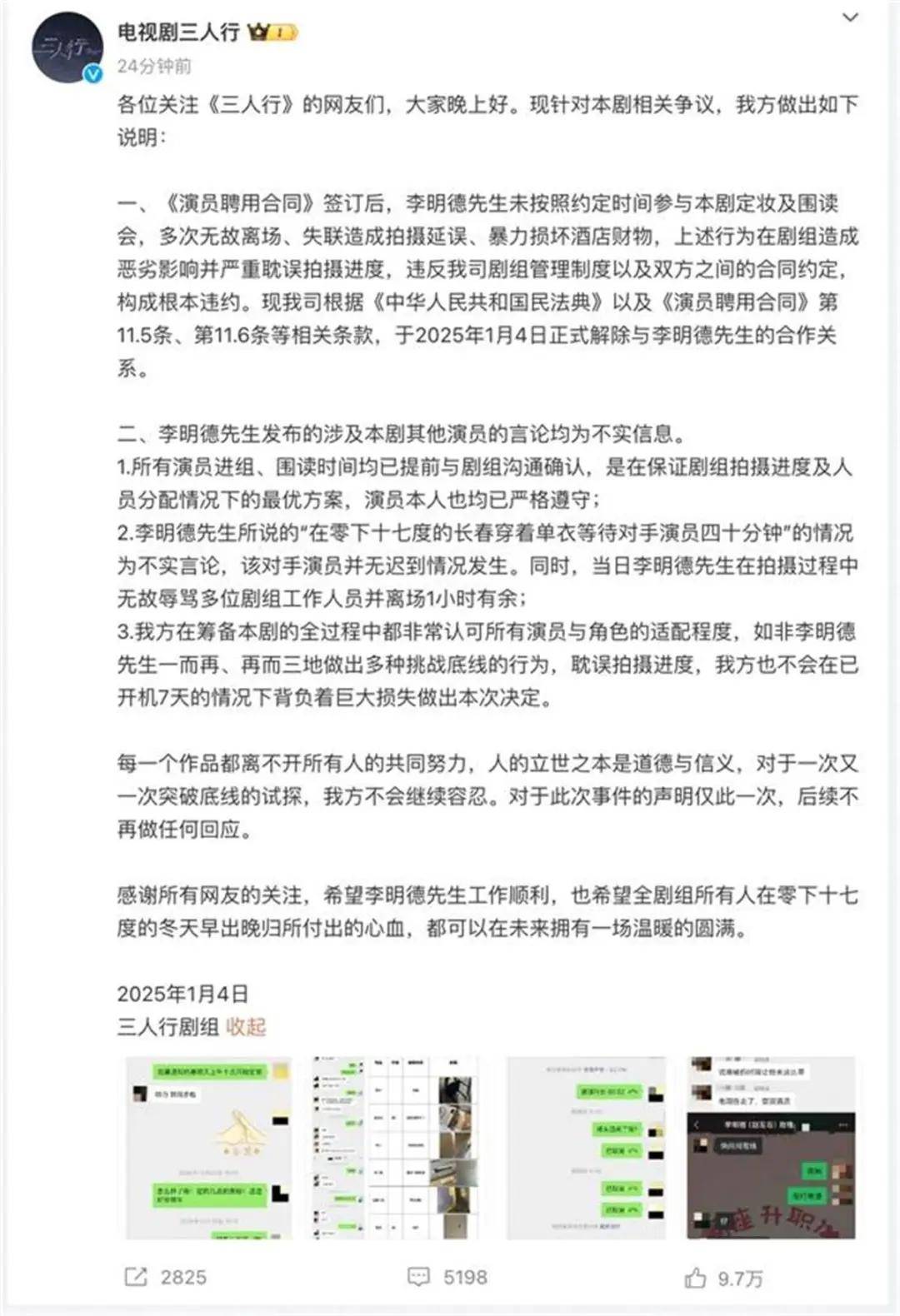 1月4日晚,《三人行》剧组发声明回应,称李明德未按照约定时间参与本剧定妆及围读会,多次无故离场、失联造成拍摄延误、暴力损坏酒店财物,所以造成违约,已于2025年1月4日正式解除与李明德的合作关系,并表示李明德发布的涉及本剧其他演员的言论均为不实信息。
