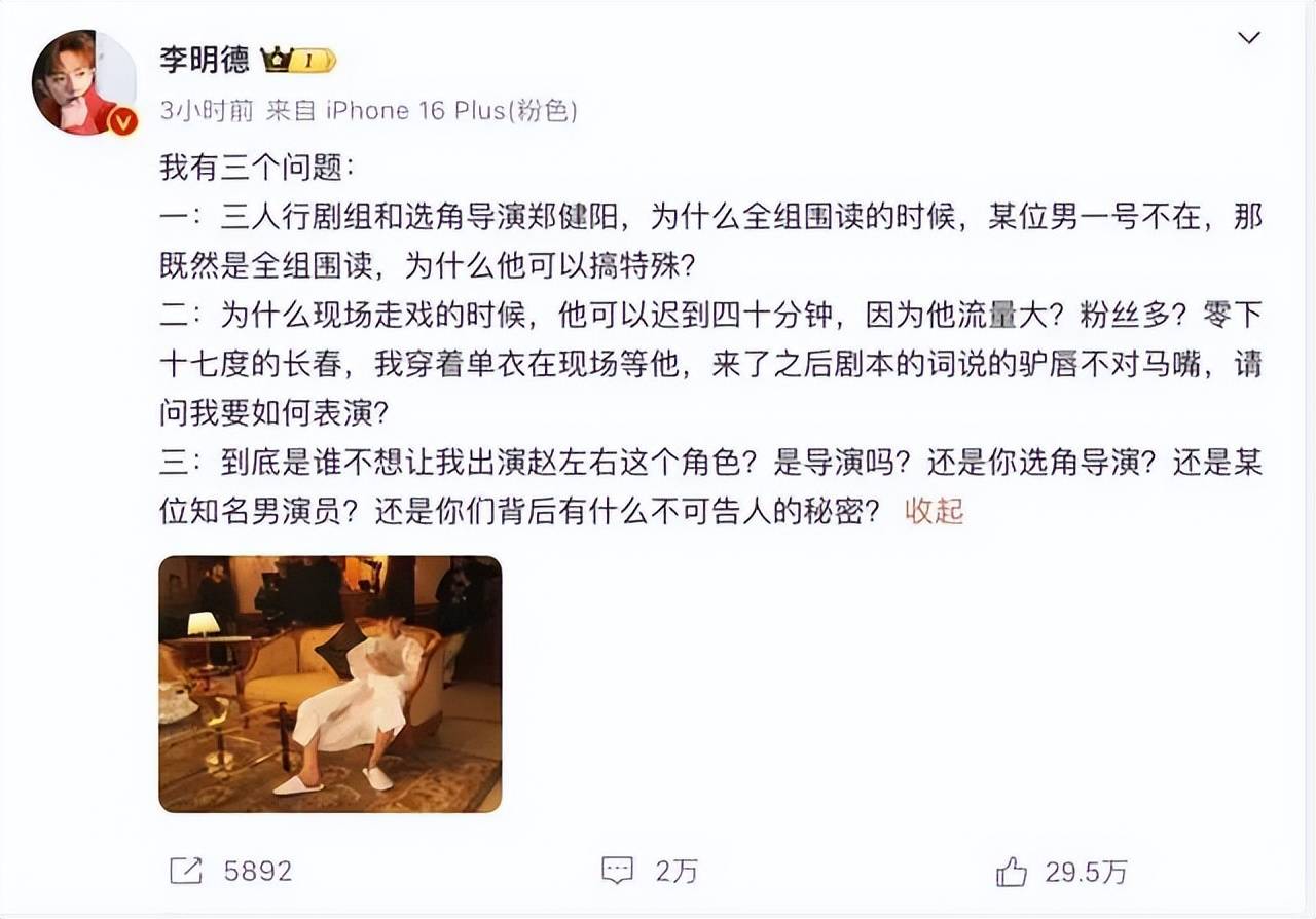 此前,李明德连发多条微博声讨《三人行》剧组,称剧组搞区别对待,全组围读男一号缺席,主演耍大牌,他穿着单衣在零下十七摄氏度的长春等了40分钟,男主角的台词却说得驴唇不对马嘴。结果他进组后被踢,疑似理由却是他“耍大牌”,他炮轰你们背后有什么不可告人的秘密?