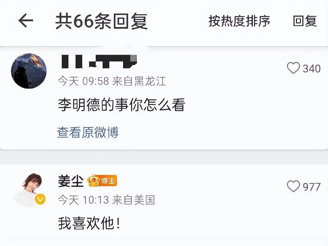 当然也有支持李明德的人,就像揭发张颂文家暴出轨的姜尘,她最新微博评论区表态支持李明德:“我喜欢他!”