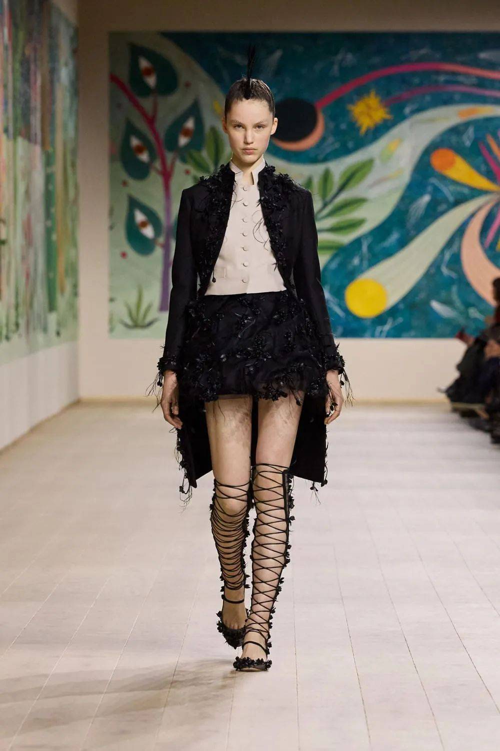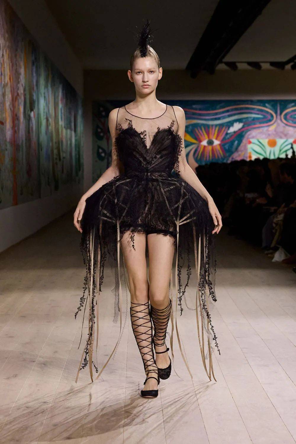 在这一季的高定系列中,形状、纹理和某种俏皮的扭曲感成为了探索品牌传统的关键要素。设计师通过对传统 Dior 服饰形状的创新演绎,赋予了它们全新的生命力。例如,经典的 A 字裙被赋予了更加夸张的比例和独特的轮廓,宽大的裙摆如同盛开的花朵,在行走间摇曳生姿,散发出一种浪漫而优雅的气息;修身的上衣则采用了不对称的剪裁和独特的肩部设计,打破了传统的束缚,展现出女性的自信与独立。
