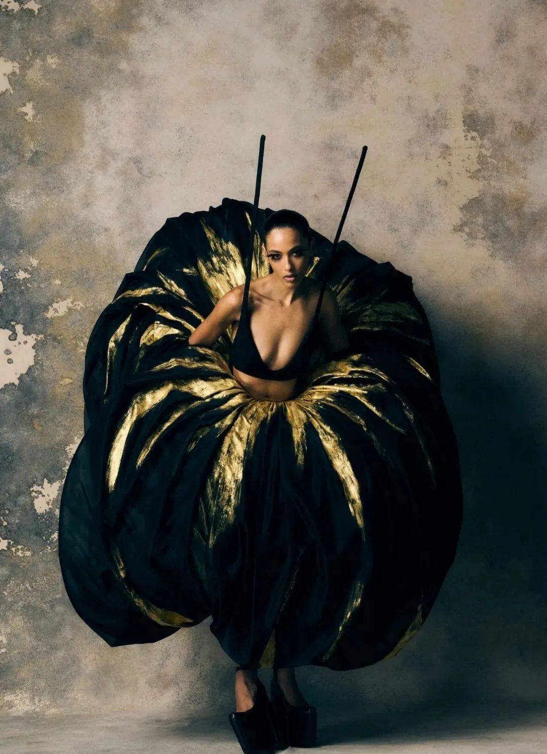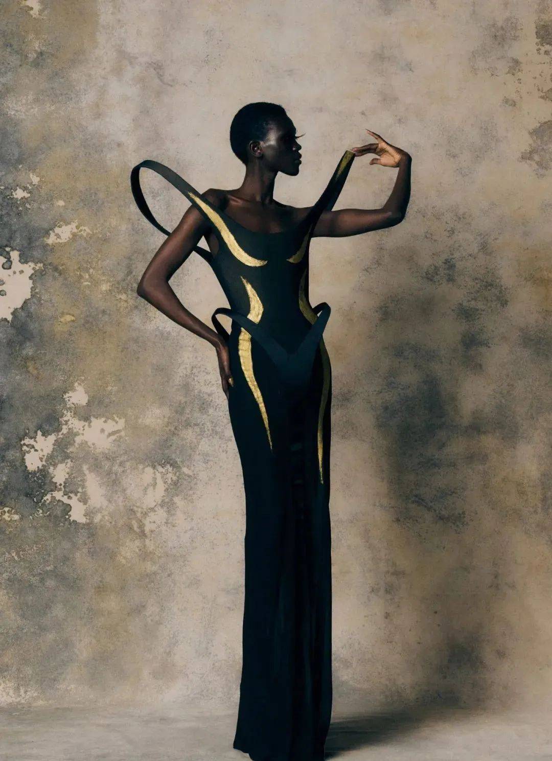 “Gilded”一词,本身就蕴含着奢华与辉煌的意味。Harris Reed巧妙地将这一主题融入设计中,通过精致的镀金元素,让每一件作品都散发着耀眼的光芒。这些镀金细节并非简单的装饰,而是设计师匠心独运的艺术创作,它们或镶嵌于领口、袖口,或点缀于裙摆、腰带,与衣物的材质、色彩和剪裁完美融合,共同构建出一种既古典又现代的美学风格。